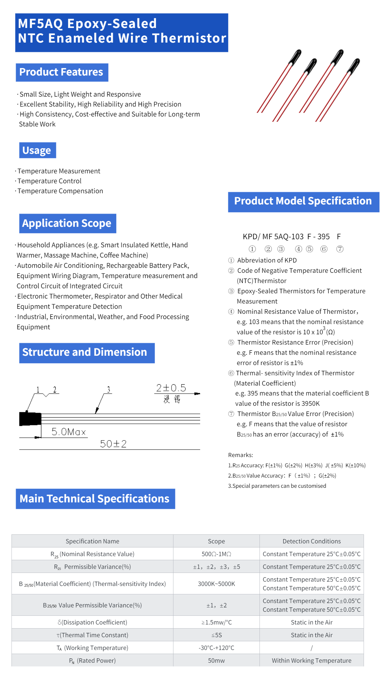 Product Feature MF5AQ Epoxy-sealed Enameled Wire NTC Thermistor